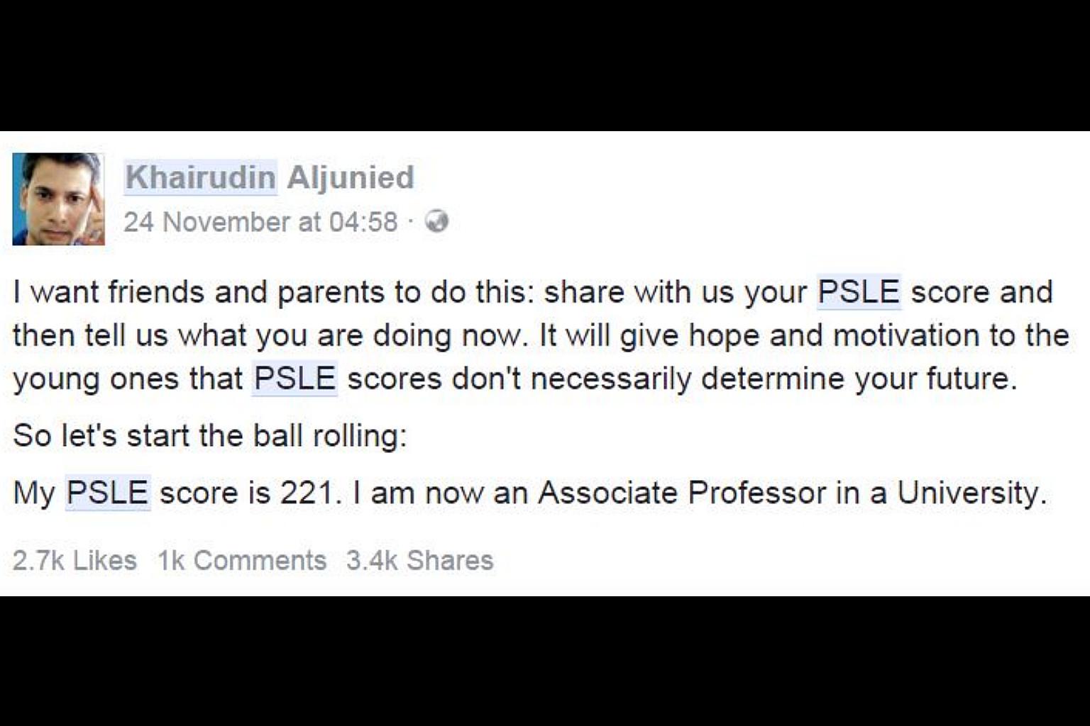 Prof Khairudin, who is with NUS' Malay Studies Department, wrote that he had an average PSLE score of 221 but was now an associate professor at a university. He urged others to share their PSLE scores and what they are doing now.