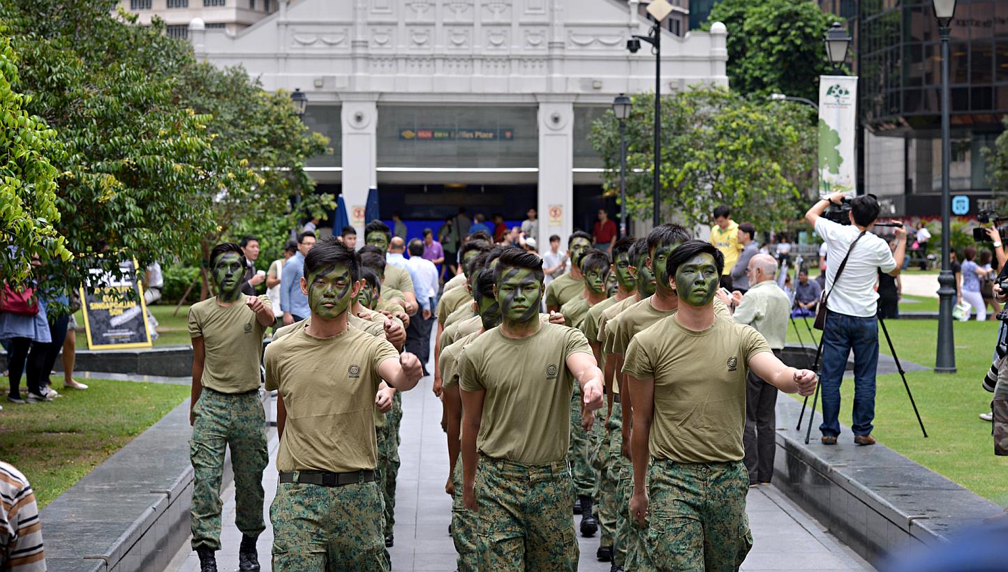 In 2013, The National Geographic Channel organised a publicity stunt in which actors dressed as soldiers marched and took commands from passers-by at Raffles Place.