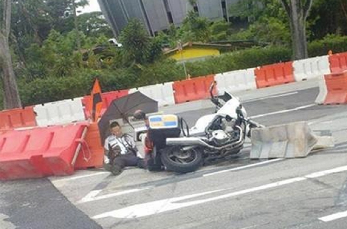 SINGAPORE - The traffic police officer pictured sitting on a road in a photo circulating online had skidded due to an oil spill and received minor injuries.