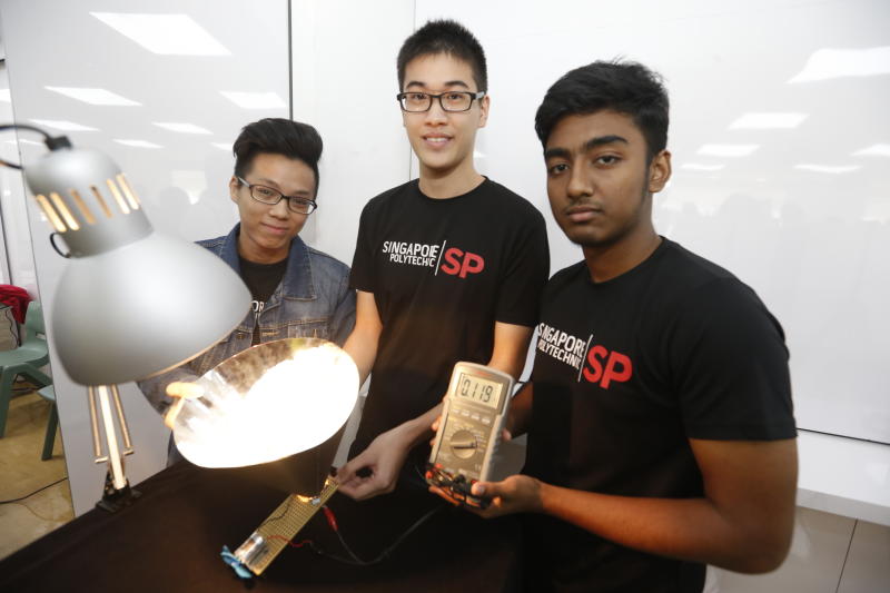 (From left) Electrical and electronic engineering students Lester Loh, 19, Ko Keng Wee, 20, and Md Tanvirul Huda, 19, from Singapore Polytechnic worked on the idea of a solar cone (Scone) which aims to increase renewable energy generation in Singapore.