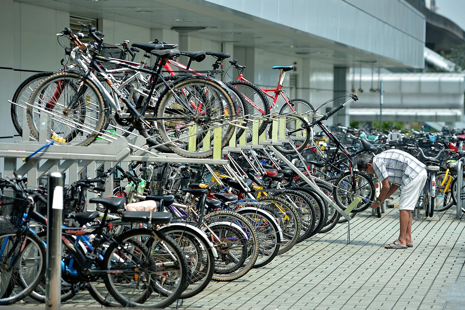 A man securing his bicycle on the bicycle rack at the Sengkang MRT station.