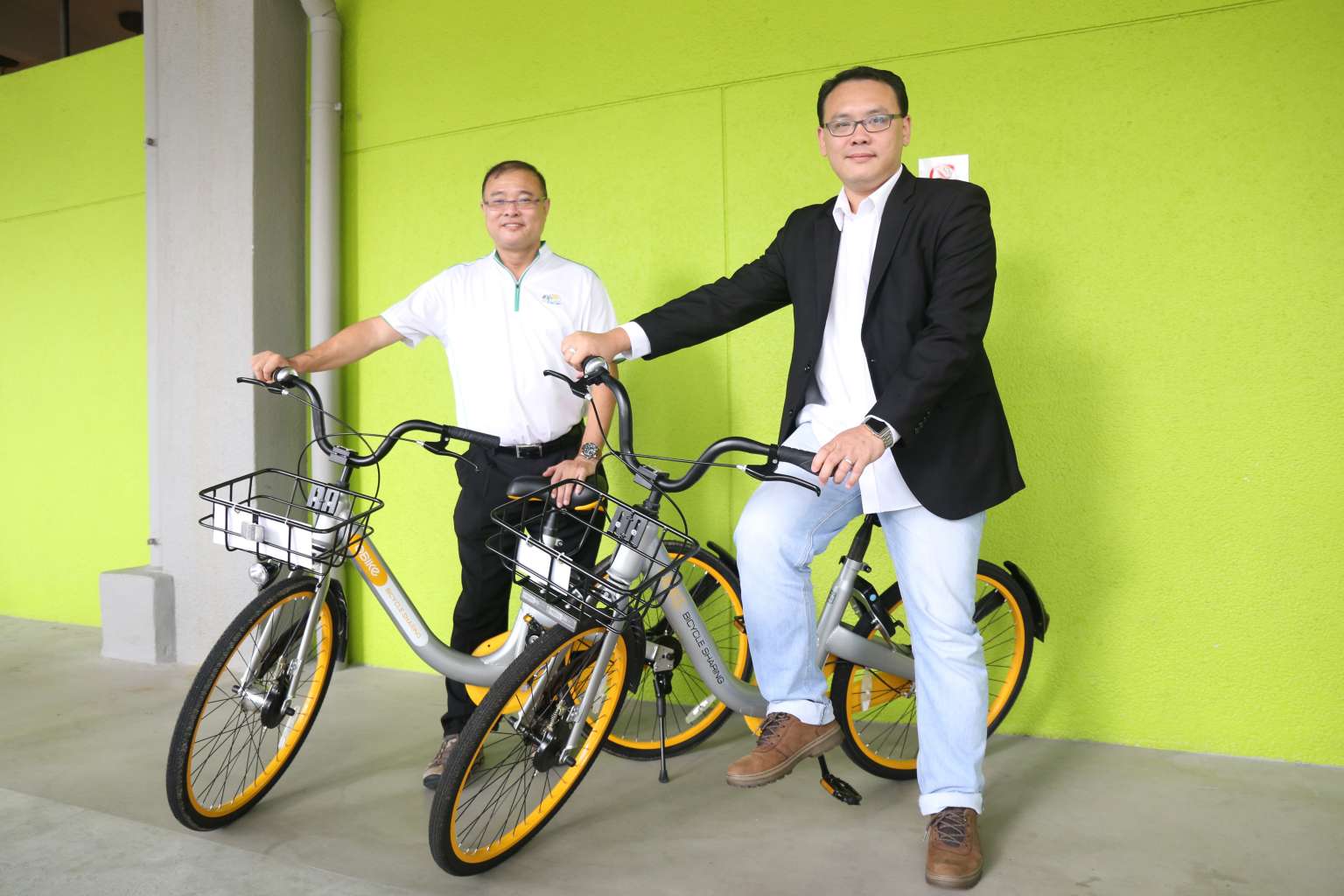 Tampines Town Council general manager Chan Wee Lee (left) and oBike general manager Elgin Ee on the bicycles.