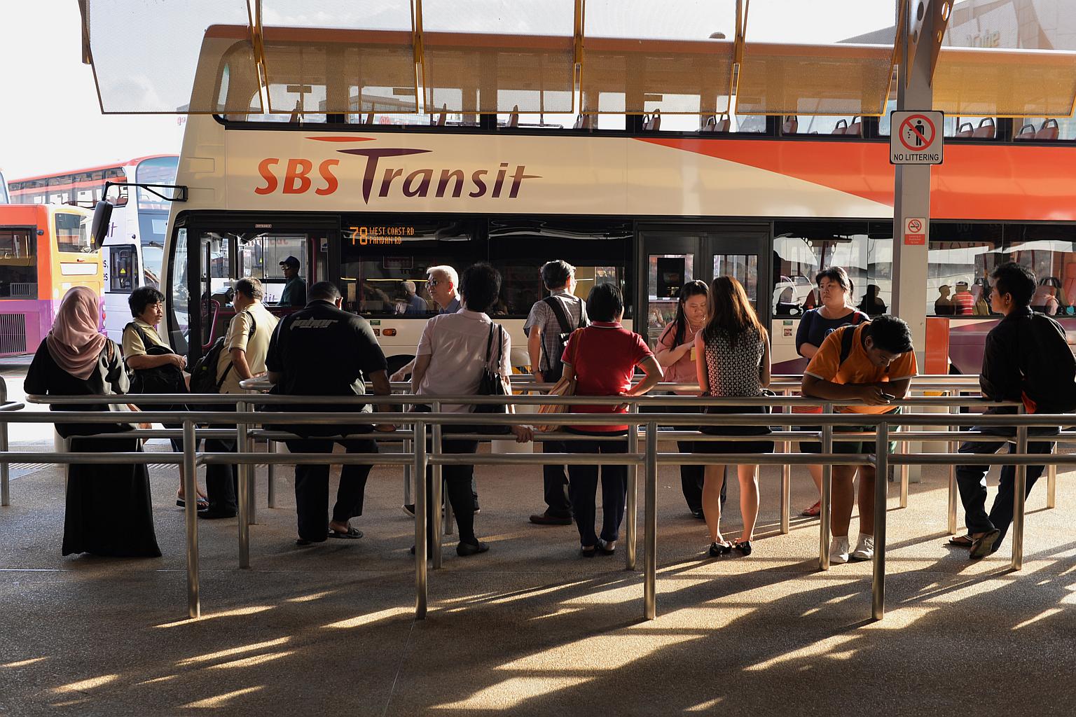 Commuters waiting in line for their buses at Jurong East bus interchange.
