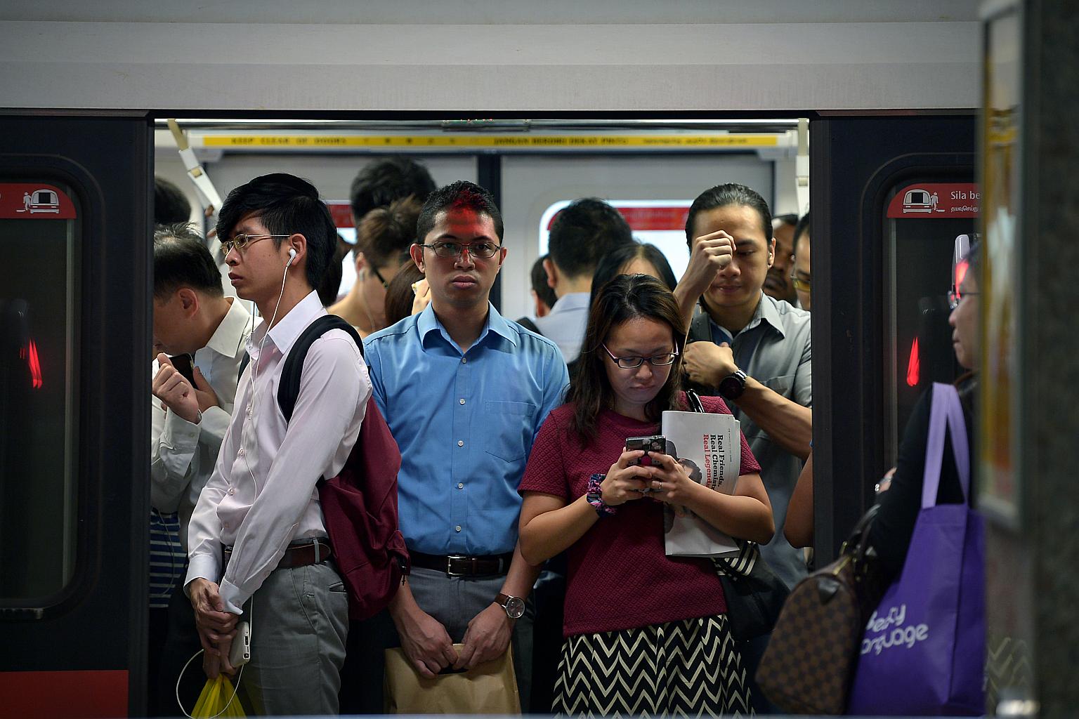 Early morning rush-hour commuters in the train at Ang Mo Kio MRT station.