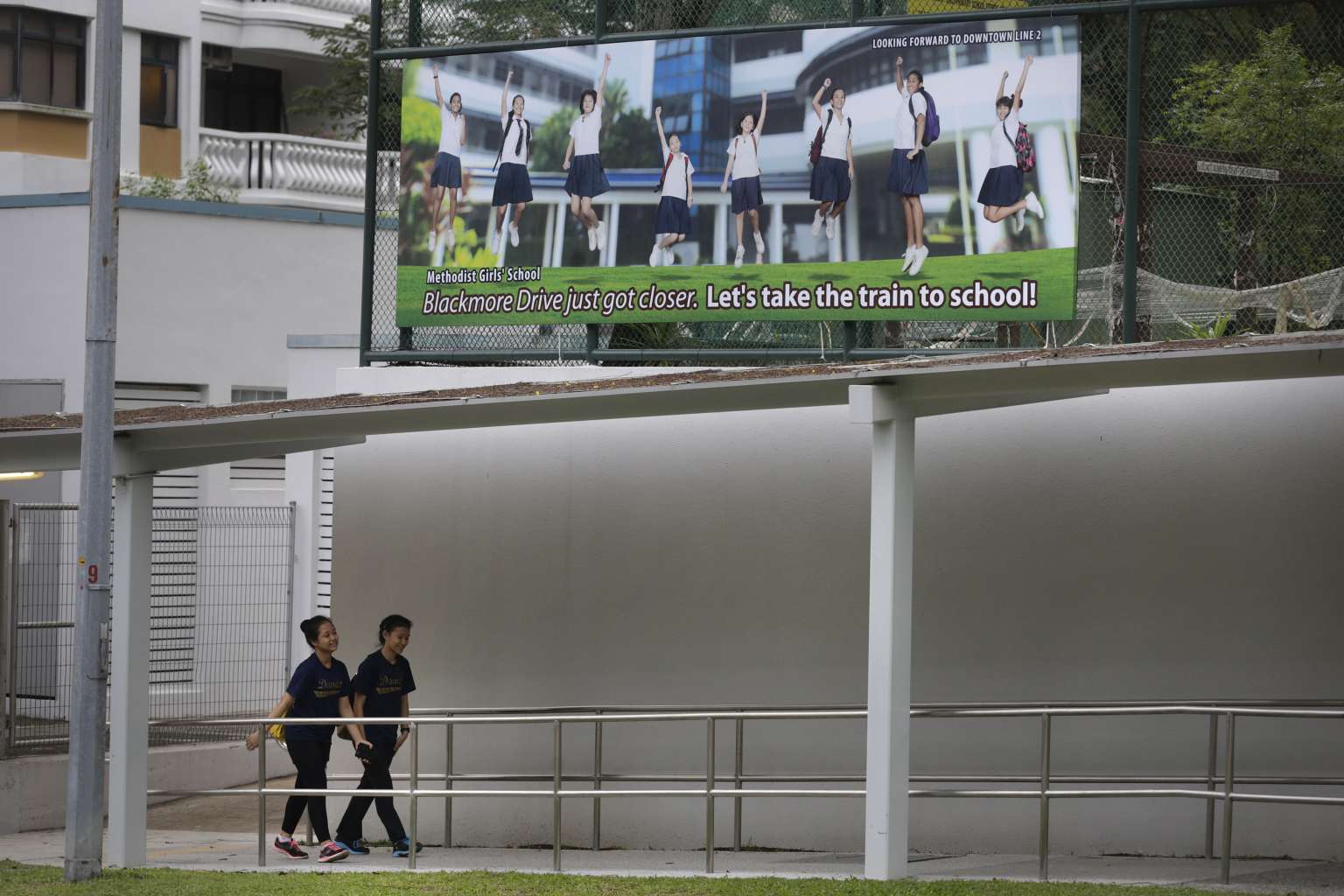 A banner encouraging students to take the MRT to commute to school is on display outside Methodist Girls' School.