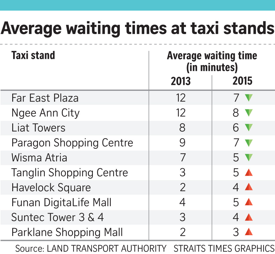 The average waiting times at a dozen major cab stands in the city fell between 2013 and last year, according to data shared by the Land Transport Authority (LTA).