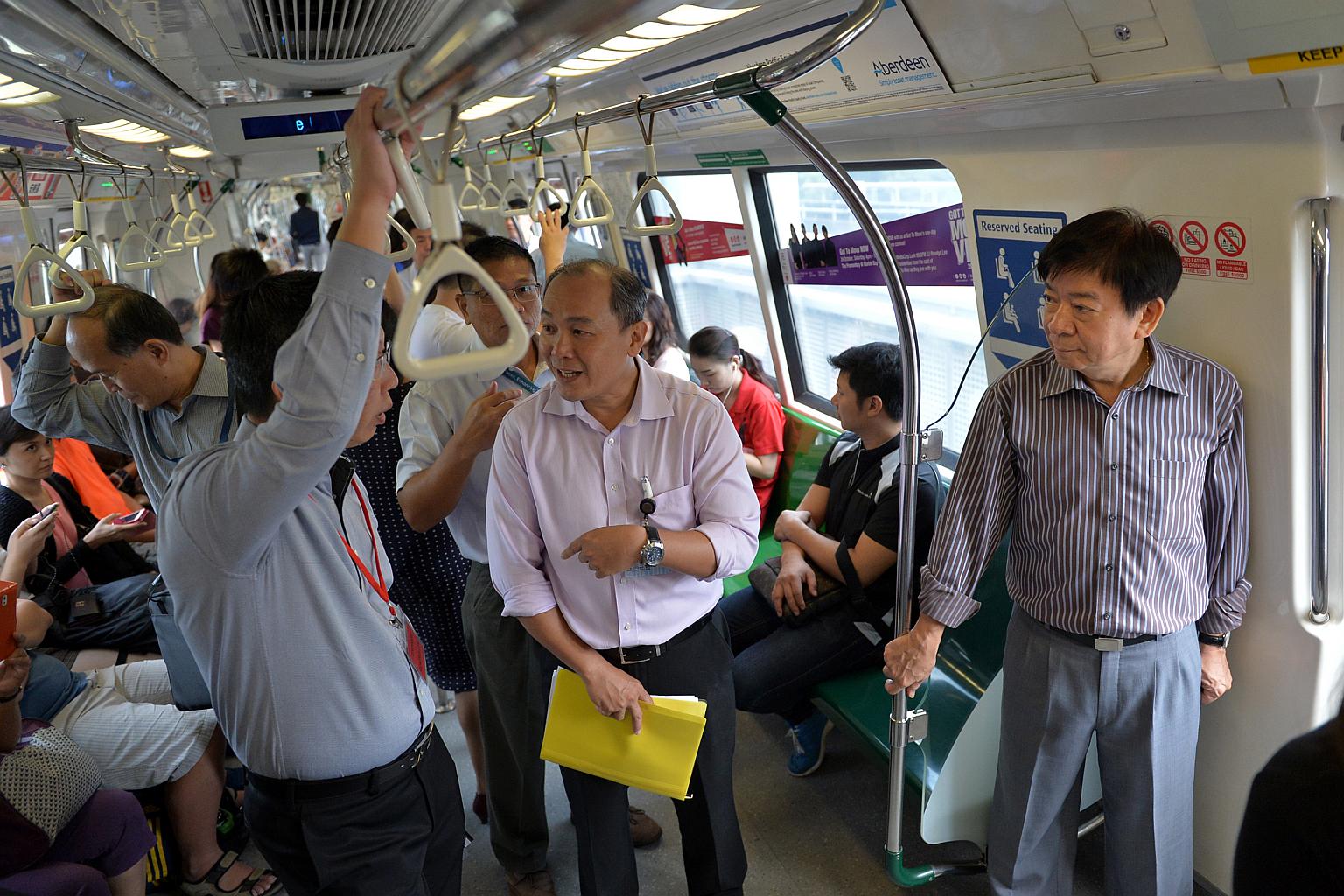 Coordinating Minister for Infrastructure & Minister for Transport Khaw Boon Wan (right) on the train with (foreground left to right) chief executive of LTA Mr Chew Men Leong and SMRT's director of Station Operations Mr Siu Yow Wee at a ground deployment exercise to test incident management plans in the event of a large scale train service disruption.