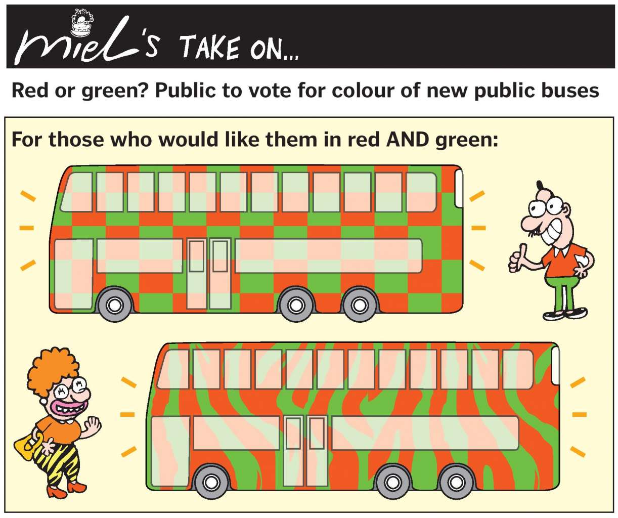 To help commuters visualize the new colour schemes, 10 bright red and 10 lush green buses will be deployed on the roads during the voting phase.