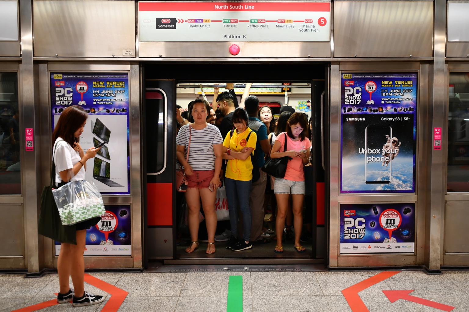 Packed train at Somerset MRT station at 3.59pm on May 28, 2017.