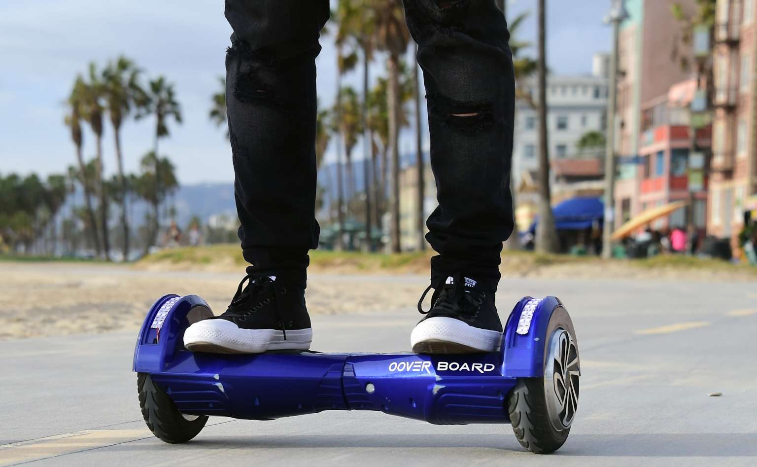 A user on his hoverboard on the Venice Beach boardwalk.