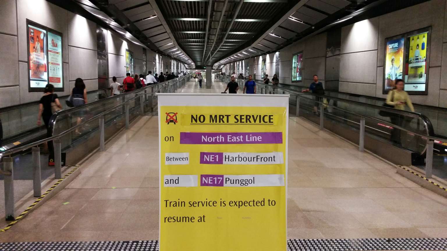 A service disruption poster seen at Serangoon station. A two-hour train disruption on the NEL on Monday morning was caused by a new train undergoing testing, the LTA said.