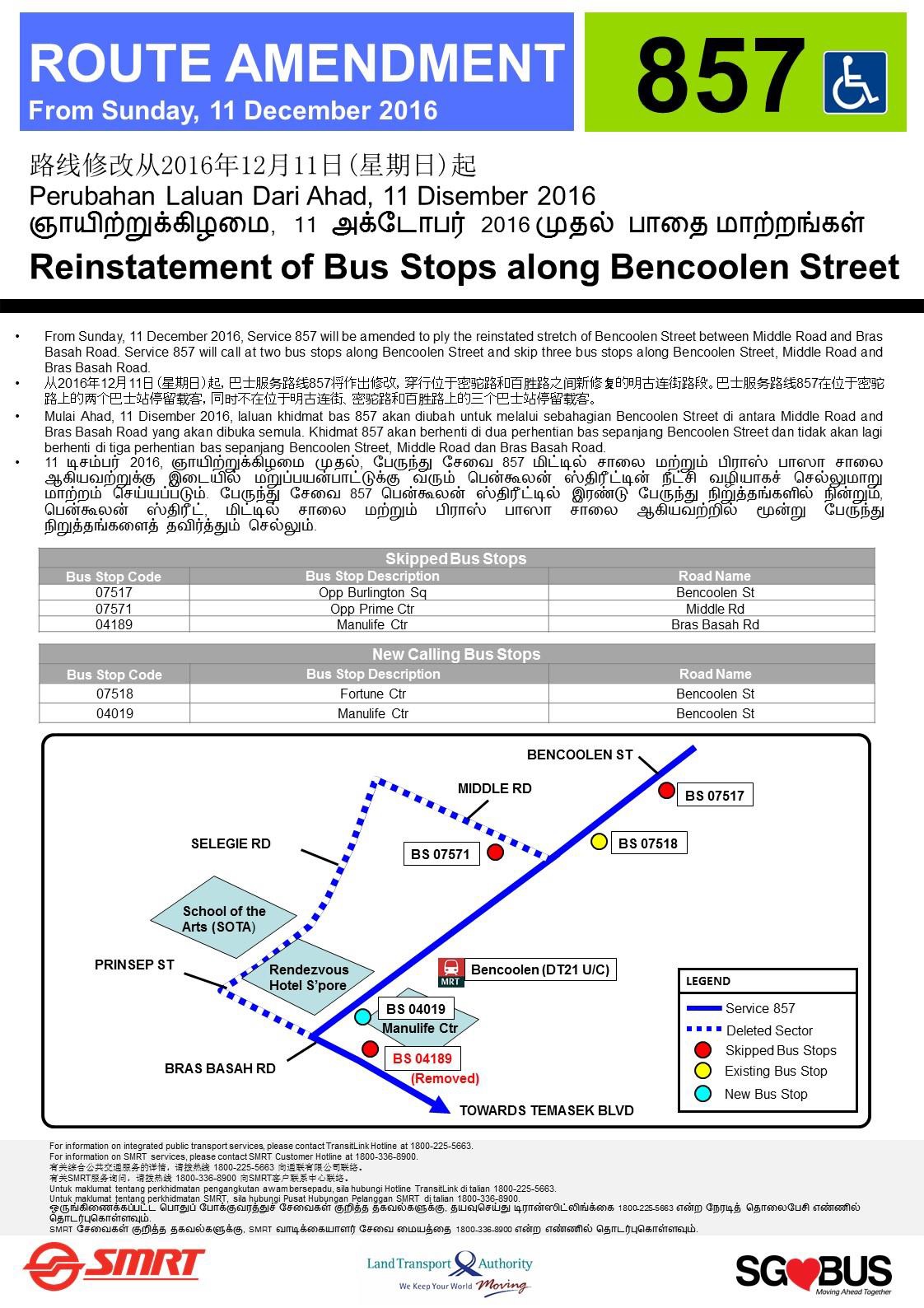 In a third press release, SMRT said that bus service 857 will have its route amended on Bencoolen Street, also from Dec 11.