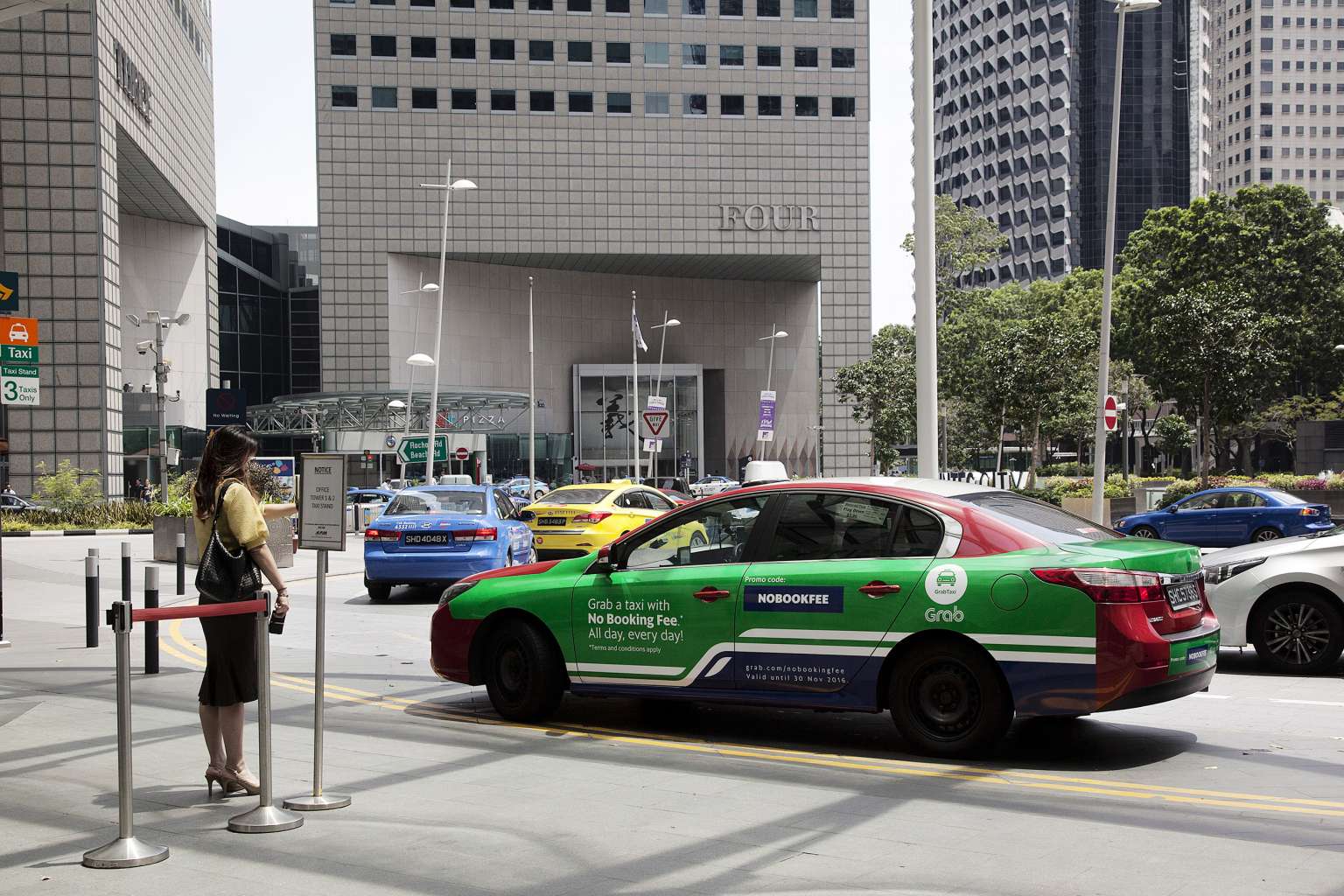 A customer hails a taxi featuring an advertisement for Grab, at the Suntec City taxi stand in Singapore, on Oct 31, 2016.