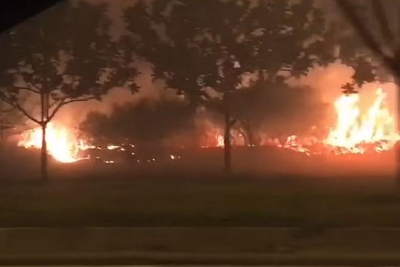 Singapore Civil Defence Force officers found "intermittent pockets of vegetation" on fire in an area measuring about four football fields in Meranti Avenue.