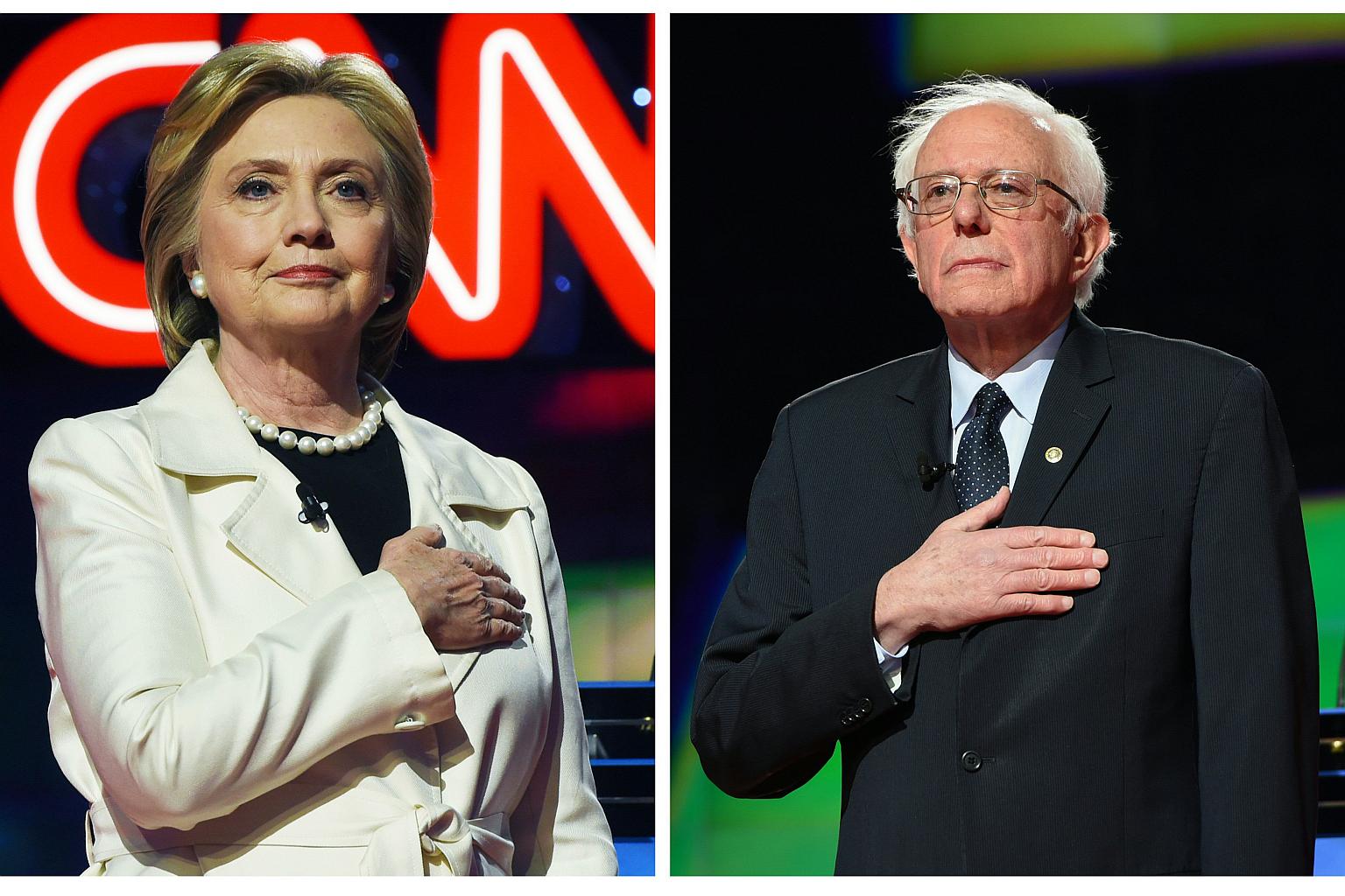 US Democratic presidential candidates Hillary Clinton (left) and Bernie Sanders before a debate in New York on April 14.