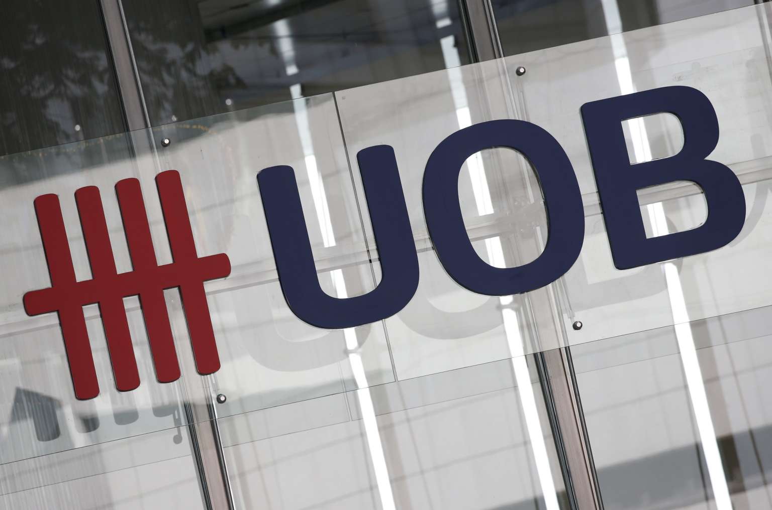 A logo of the United Overseas Bank Limited (UOB) outside a branch in Singapore's central business district.