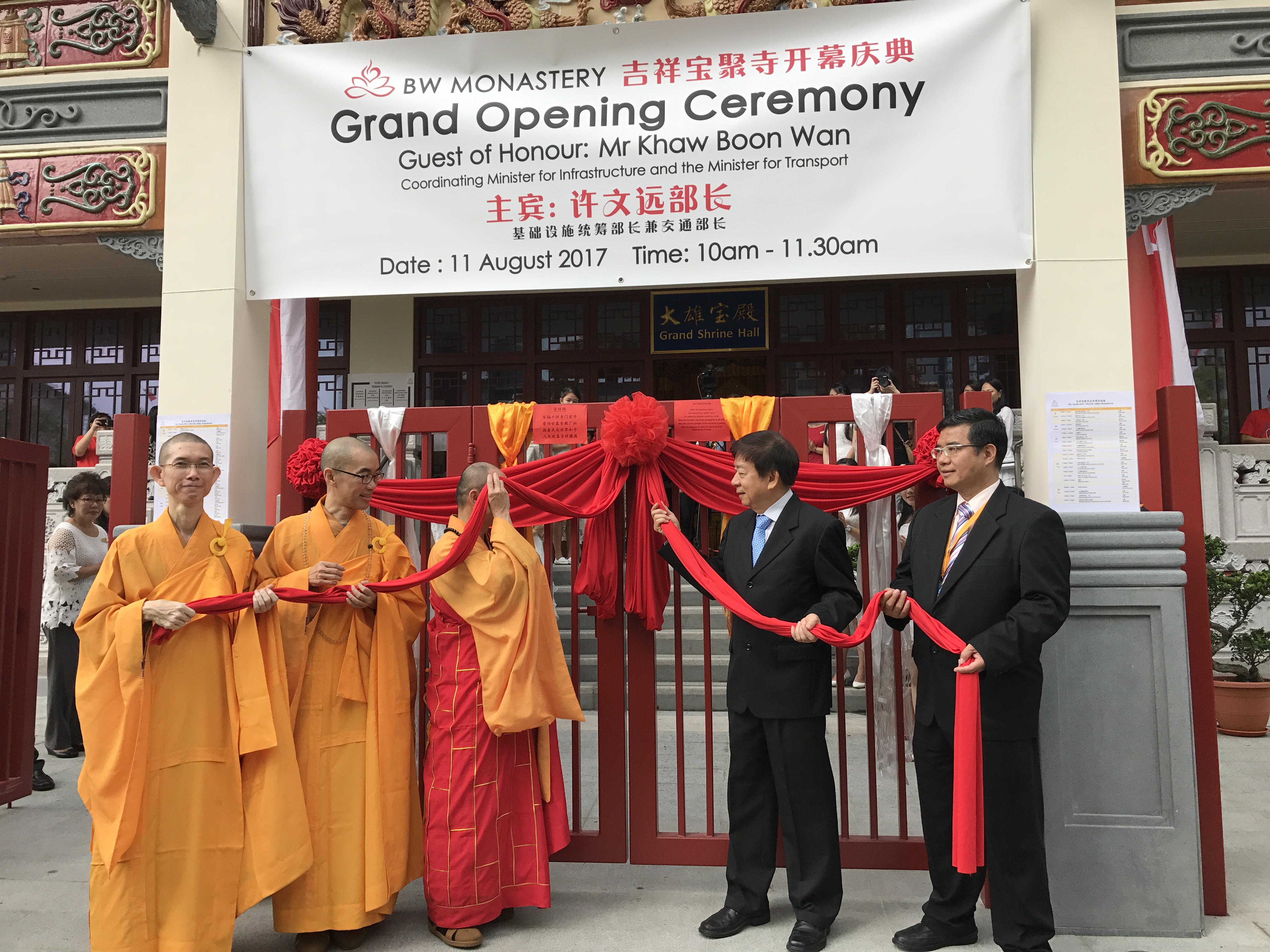 From left: Venerable Ben Wen, Deputy Abbot Venerable Ben Si, Abbot Venerable Jing Yuan, Coordinating Minister for Infrastructure and Minister for Transport Khaw Boon Wan and BW Monastery management committee member Dr Oh Kheng Hoe about to officially open BW Monastery in Woodlands on Aug 11.