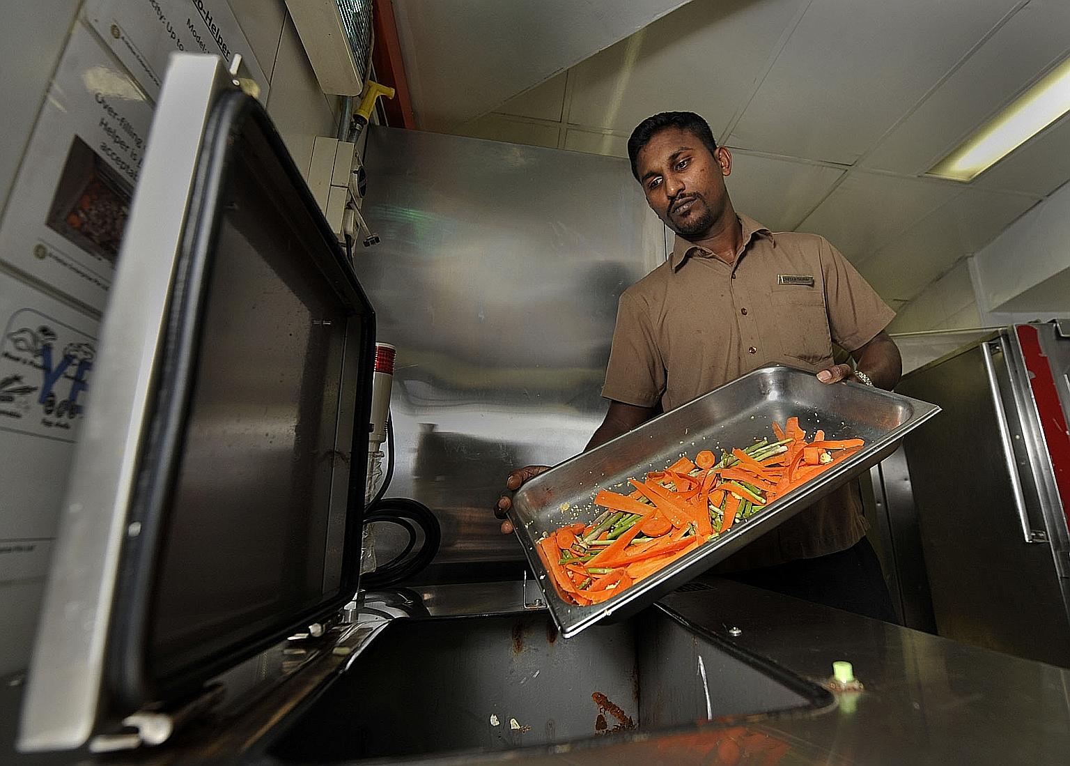 A steward at Fairmont Singapore putting food scraps into a machine that converts solid food waste into fertilisers and liquids in 2012.
