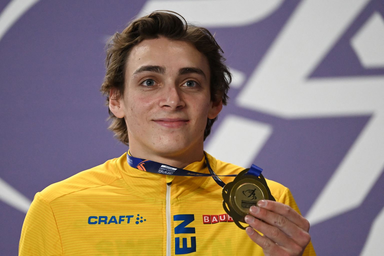 Sweden's Armand Duplantis celebrates his gold medal on the podium at the 2021 European Athletics Indoor Championships in Torun, on March 7, 2021.