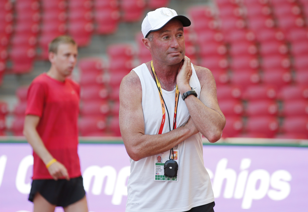 Coach Alberto Salazar (in white) stands in the Bird's Nest Stadium at the Wold Athletics Championships in Beijing on Aug 21, 2015.