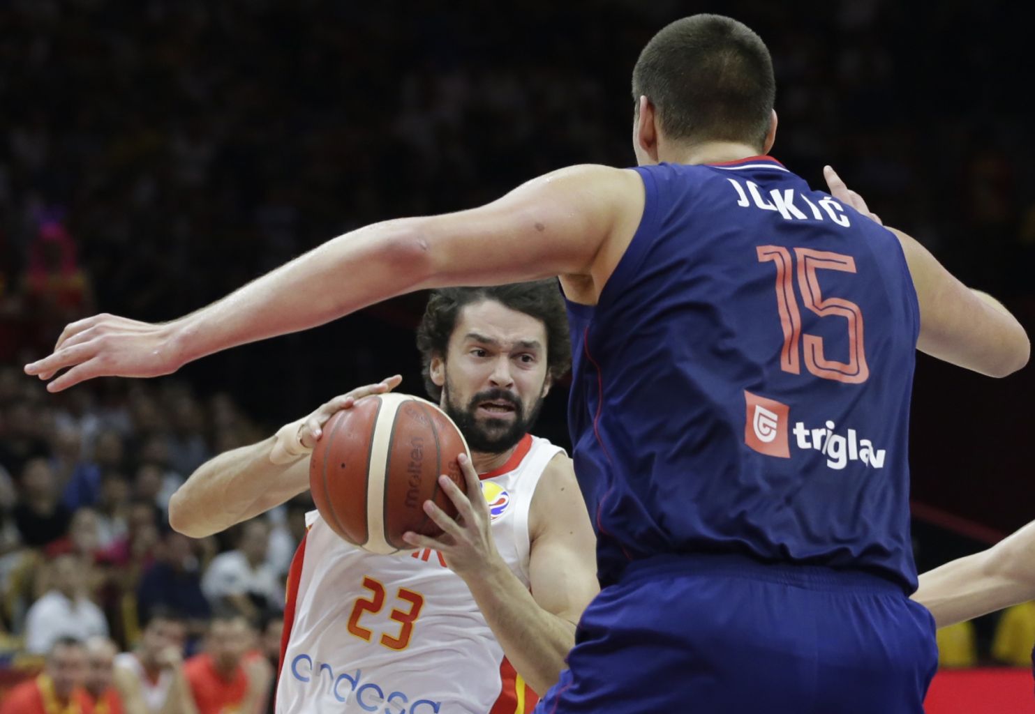 Spain's Sergio Llull in action with Serbia's Nikola Jokic.