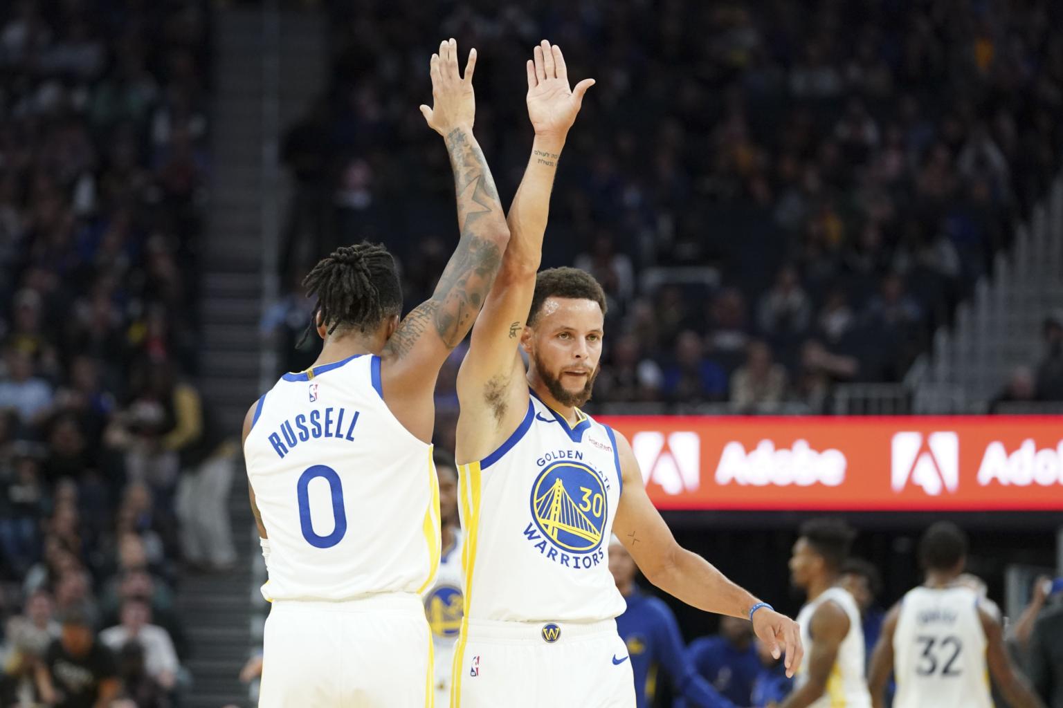 Golden State Warriors guard Stephen Curry (right) celebrating during the match against the Minnesota Timberwolves, on Oct 10, 2019.