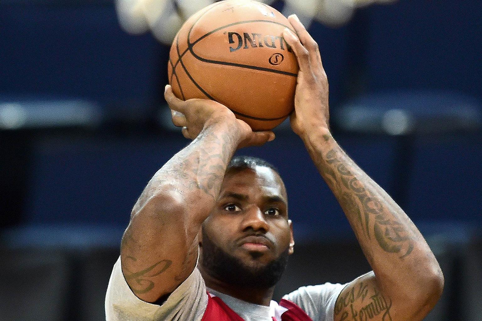 LeBron James of the Cleveland Cavaliers shoots during a practice session.