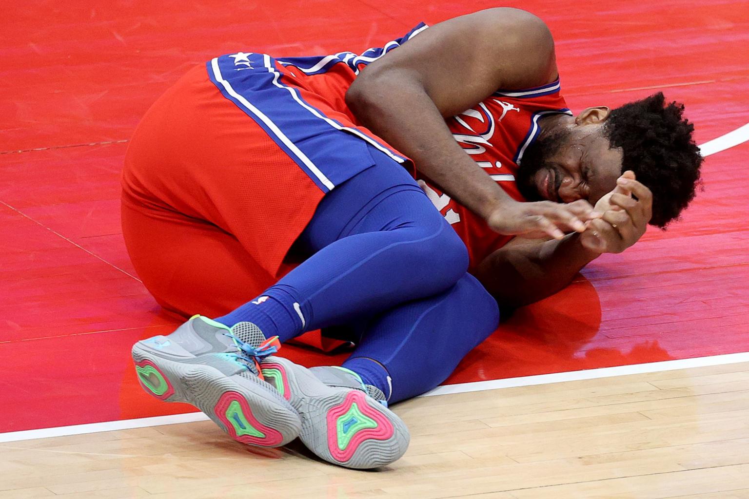 Joel Embiid after getting injured in the second half against the Washington Wizards at Capital One Arena in Washington DC, on March 12, 2021.