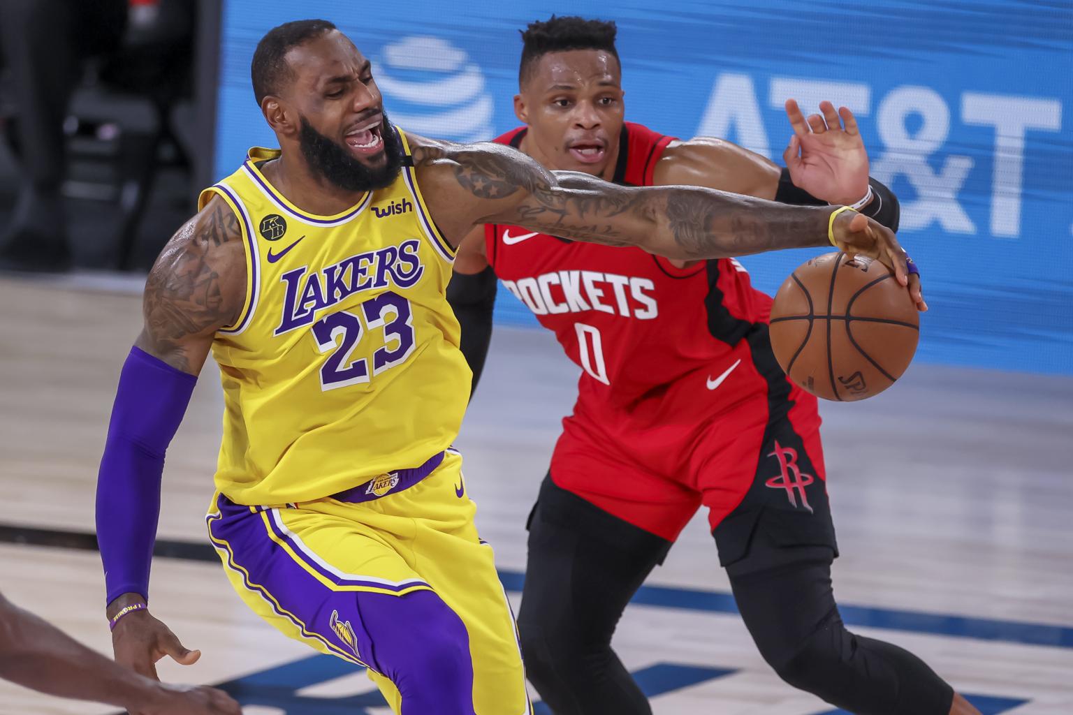 Los Angeles Lakers forward LeBron James in action against Houston Rockets guard Russell Westbrook at the ESPN Wide World of Sports Complex on Sept 10, 2020.