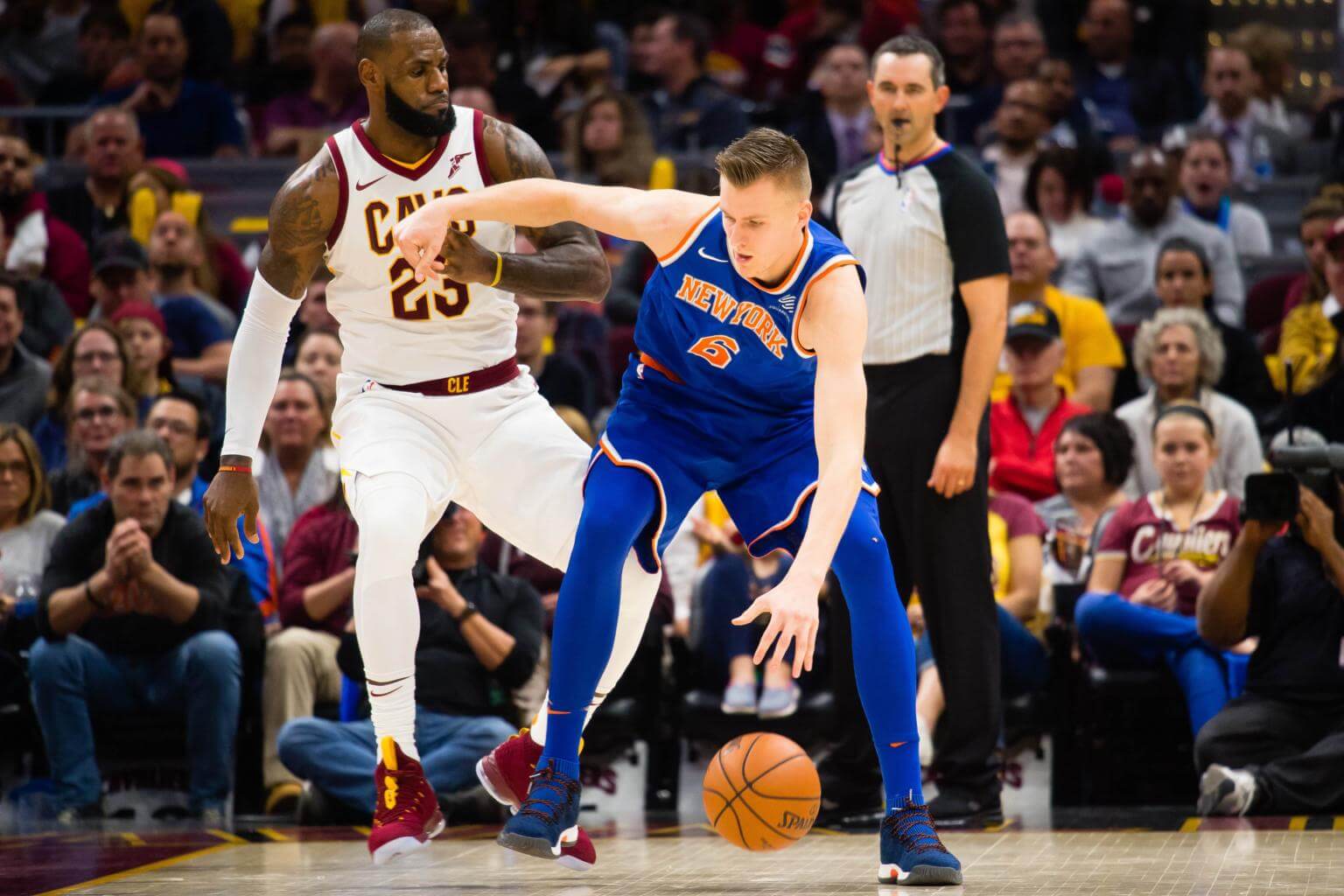Cleveland Cavaliers' LeBron James (left) puts pressure on New York Knicks' Kristaps Porzingis during the second half.