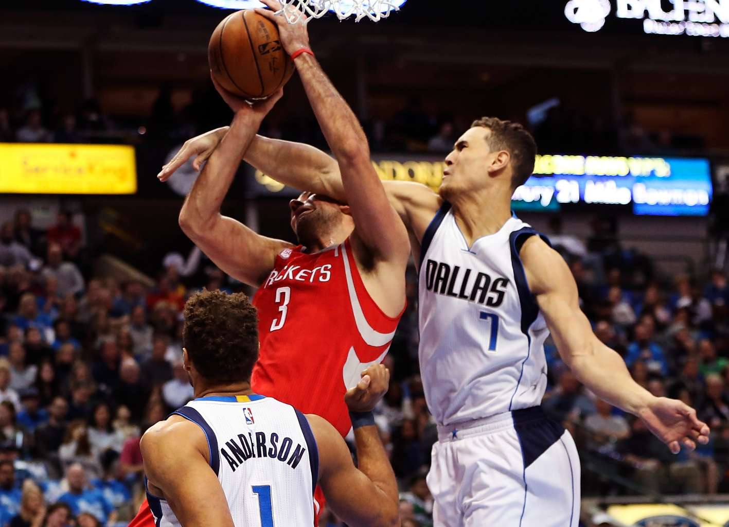 Dallas Mavericks forward Dwight Powell (#7) fouls Houston Rockets forward Ryan Anderson (#3) during their NBA game on Dec 27, 2016.