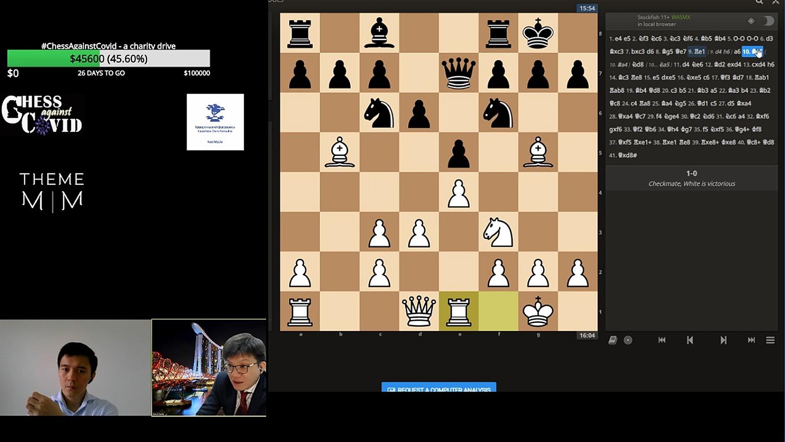 Chess grandmasters Kevin Goh and Kazakh Rinat Jumabayev commentating during the Age Group Battle exhibition games yesterday, when $4,500 was raised as part of the #ChessAgainstCovid initiative started by the Singaporean. The charity drive hopes to get individuals to participate in chess events, with a goal of raising $100,000 for Lakeside Family Services' Caring Amidst Covid-19 Fund. More than $50,000 has been raised since April 11. Goh Zi Han, 11, and Siddharth Jagadeesh, 13, were among the young players taking part in yesterday's games against peers from Kazakhstan.