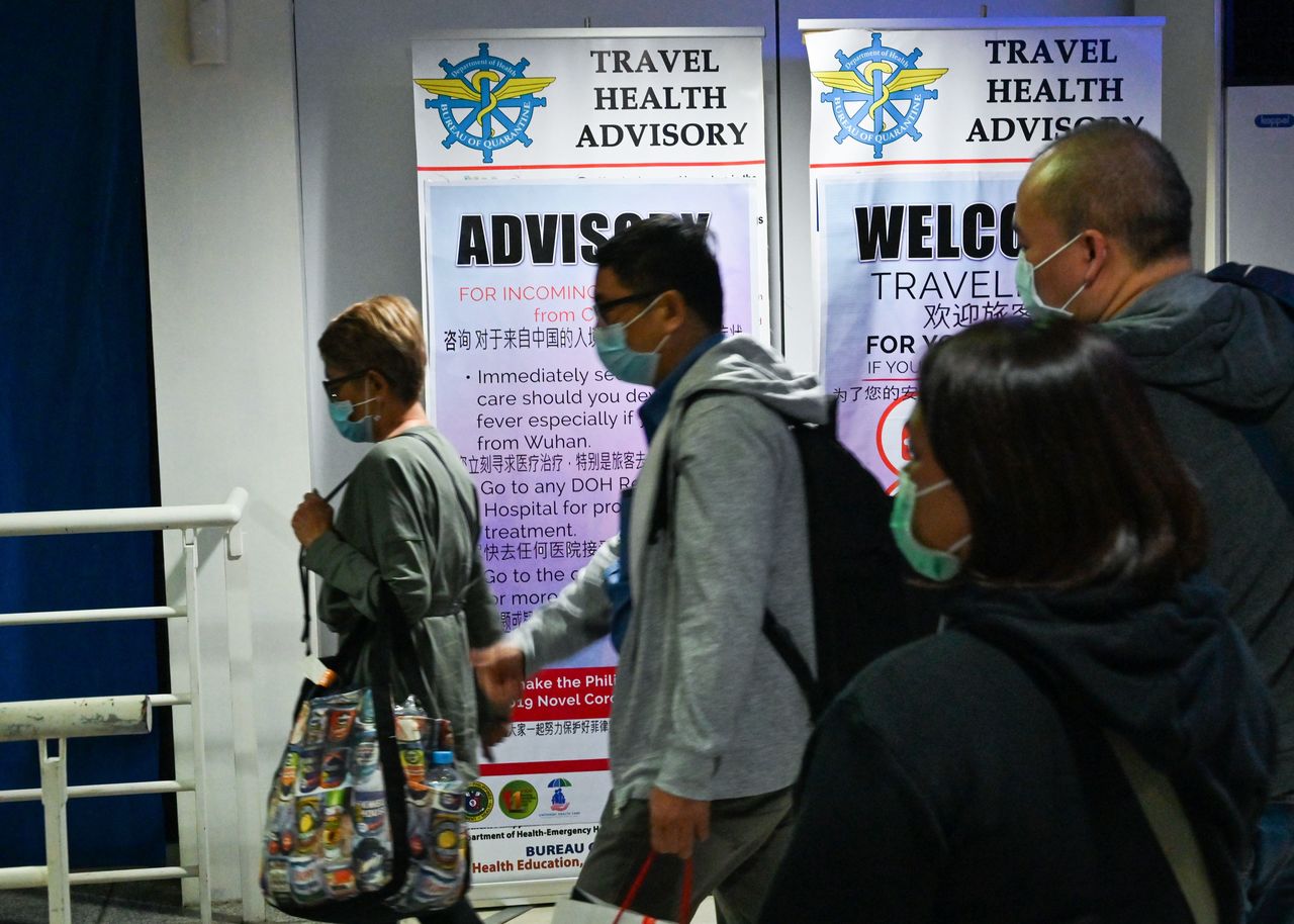 Travellers wearing protective face masks walk past a travel health advisory sign upon arrival at the international airport in Manila on Feb 5, 2020.