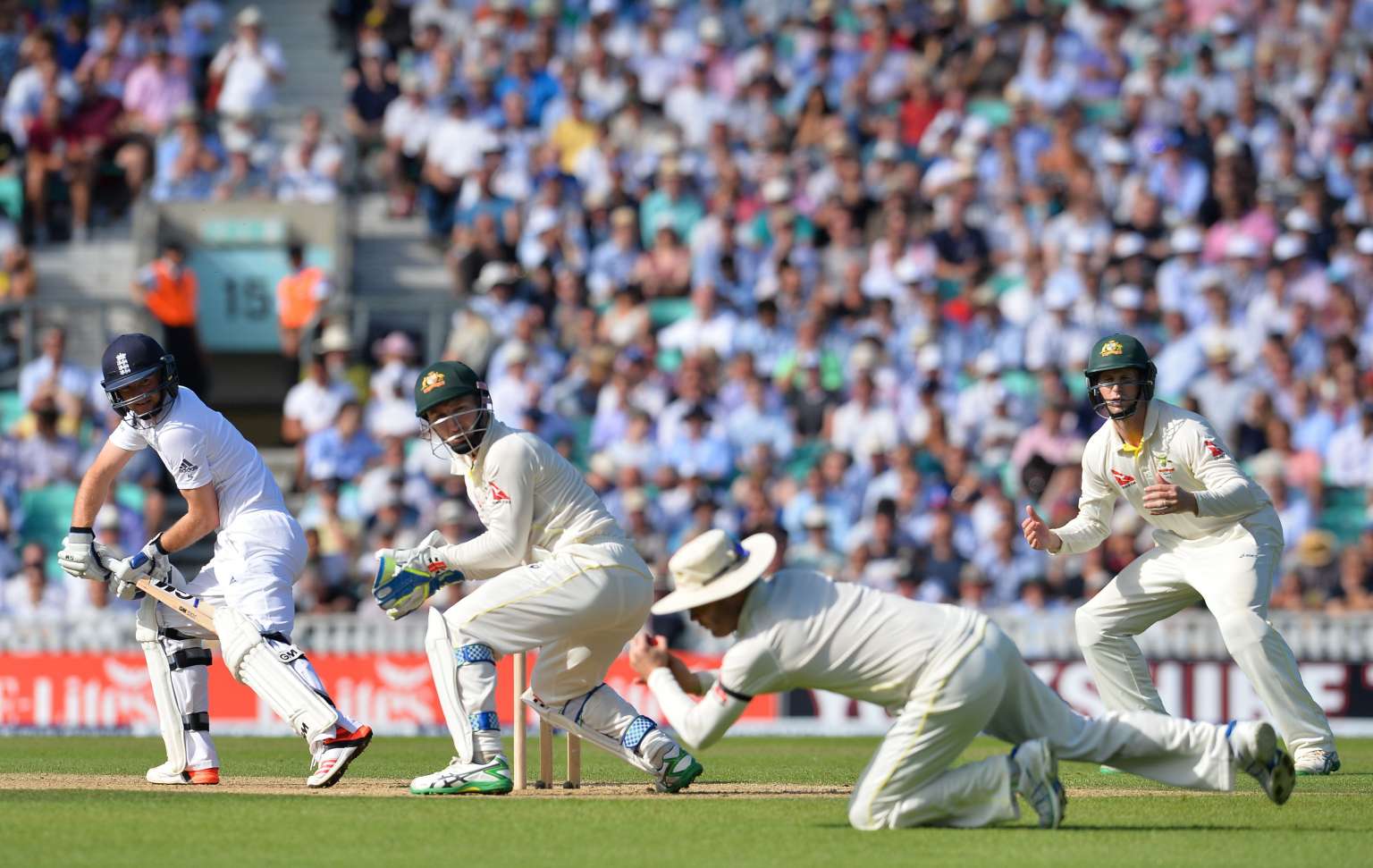 Adam Lyth (left) looks over as Australia's Michael Clarke (2nd right) picks up the ball on the second day of the fifth Ashes cricket Test match between England and Australia at the Oval in London on Aug 21, 2015.
