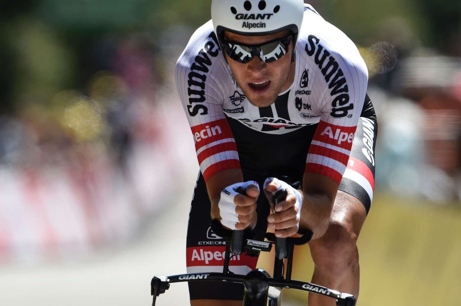 The Netherlands' Tom Dumoulin crosses the finish line.