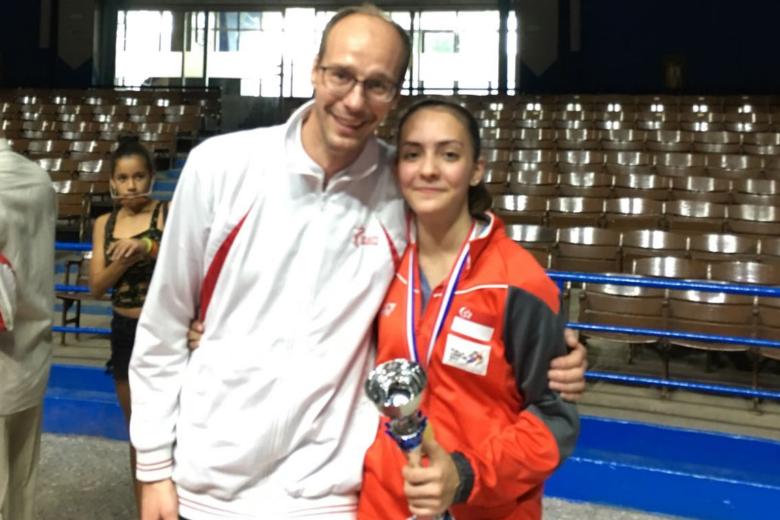 Singapore's foil fencer Amita Berthier (right), poses with coach Ralf Bissdorf after winning the Junior World Cup title in Havana. The 17-year-old is the first Singaporean to win a title in the eight-leg series.
