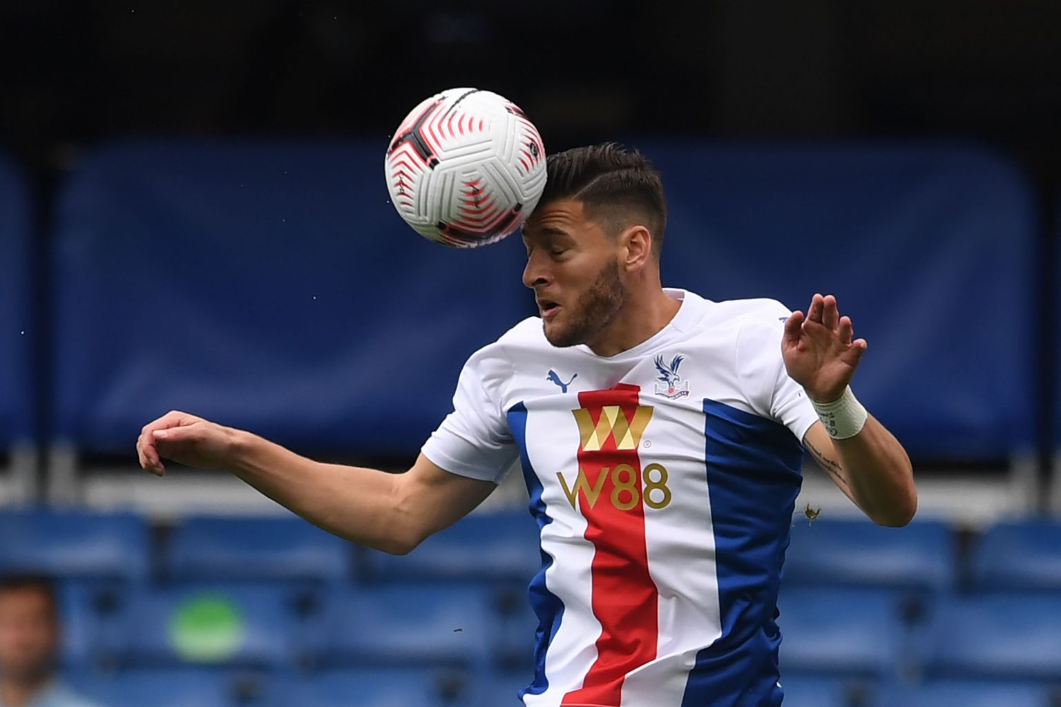 Crystal Palace's Joel Ward heads the ball during a Premier League match against Chelsea.