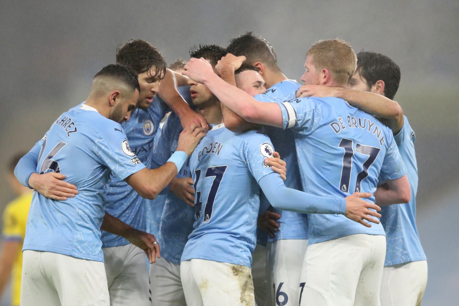 Manchester City's Phil Foden celebrates scoring their first goal with teammates in Britain on Jan 13, 2021.