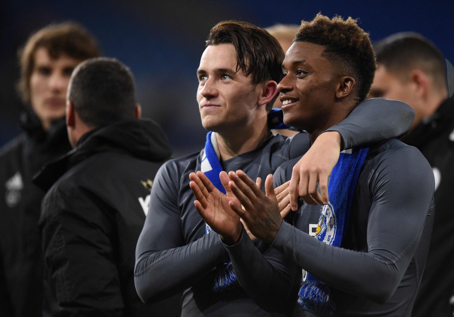 Leicester City's Ben Chilwell (centre) and Demarai Gray applaud fans after the match.
