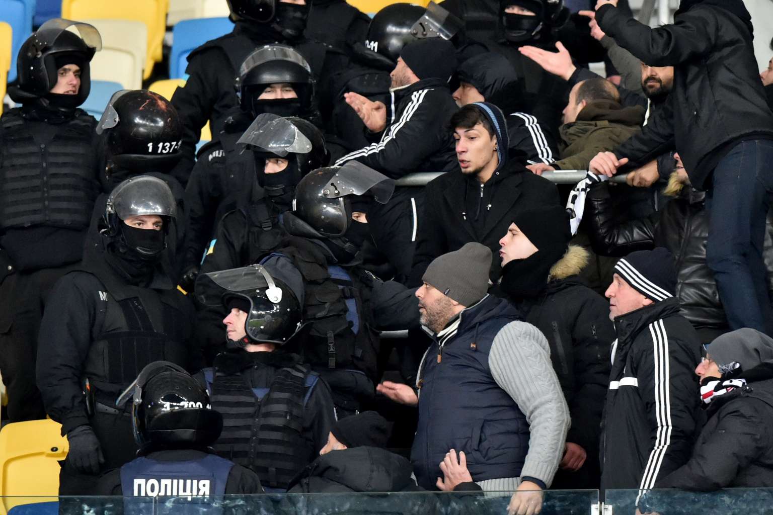 Besiktas supporters clash with riot police officers during the UEFA Champions League football match between FC Dynamo Kyiv and Besiktas at the Olympiyski Stadium in Kiev.