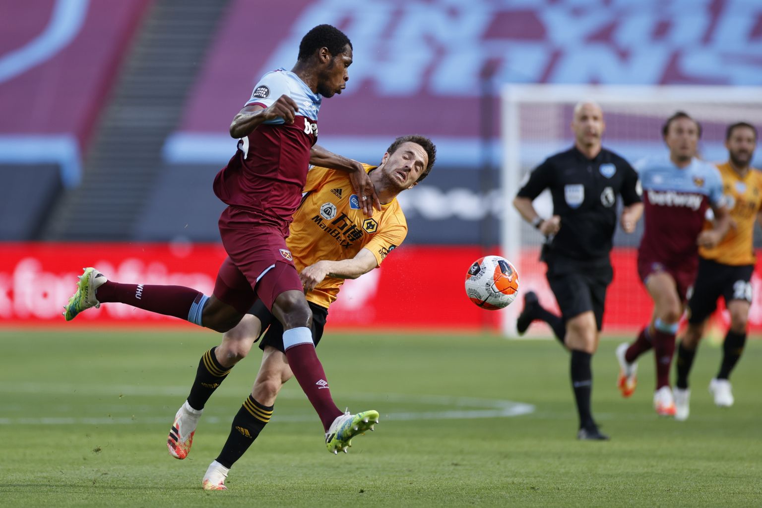 Haller (left) in action for West Ham against Diogo Jota of Wolverhampton Wanderers on June 20, 2020.