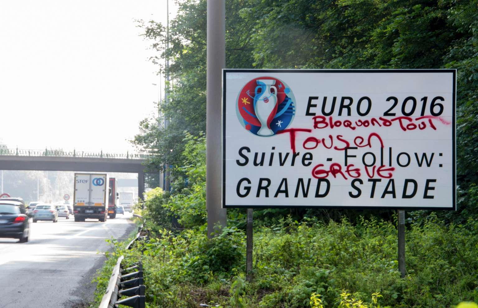 Graffiti reading "Let's block everything, all on strike" is seen scribbled on a signboard for the Euro 2016 football competition, in Lille, France, on June 6, 2016.