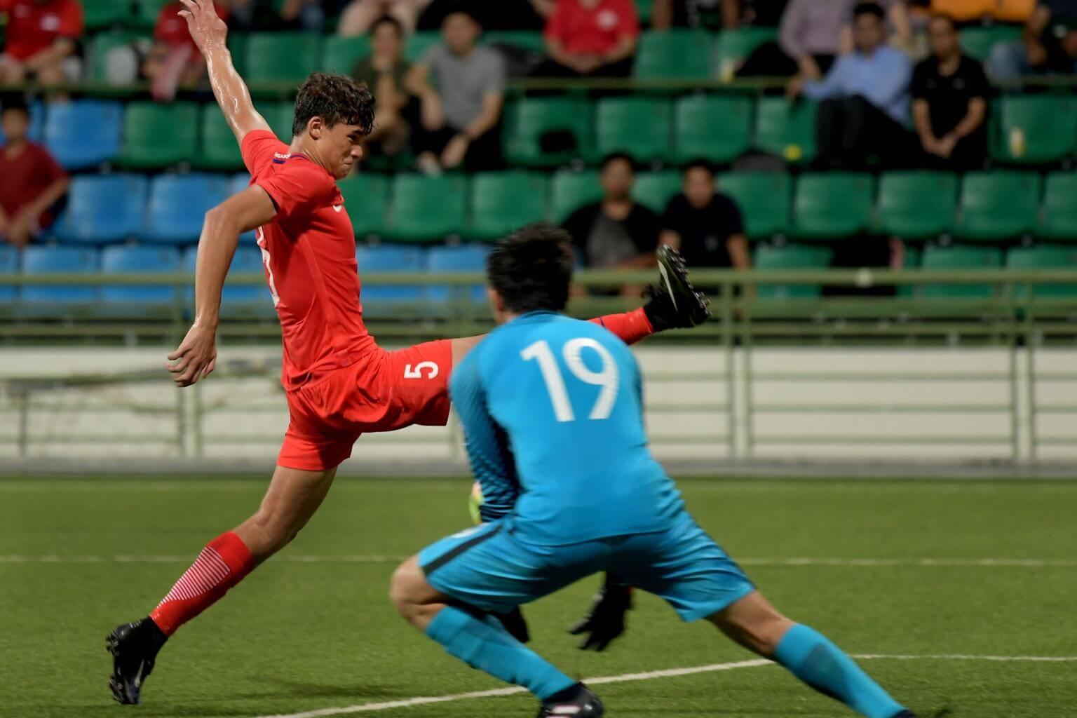 Ikhsan Fandi attempting a shot at goal but goalkeeper Wan Zhenpeng gets to the ball.