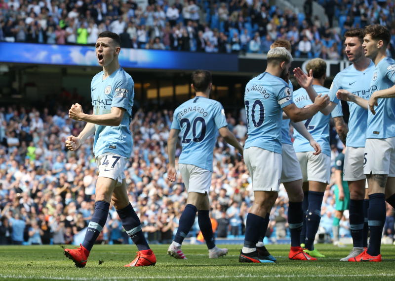Manchester City's Phil Foden celebrates scoring a goal during the English Premier League match against Tottenham Hotspur at the Etihad Stadium in Manchester on April 20, 2019.