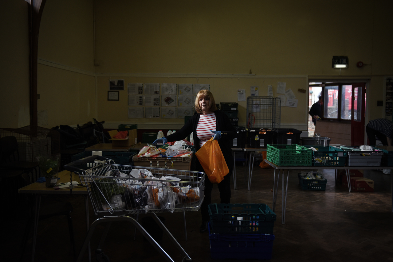 A volunteer at the Newcastle West End food bank in Newcastle, England, on March 19, 2020.