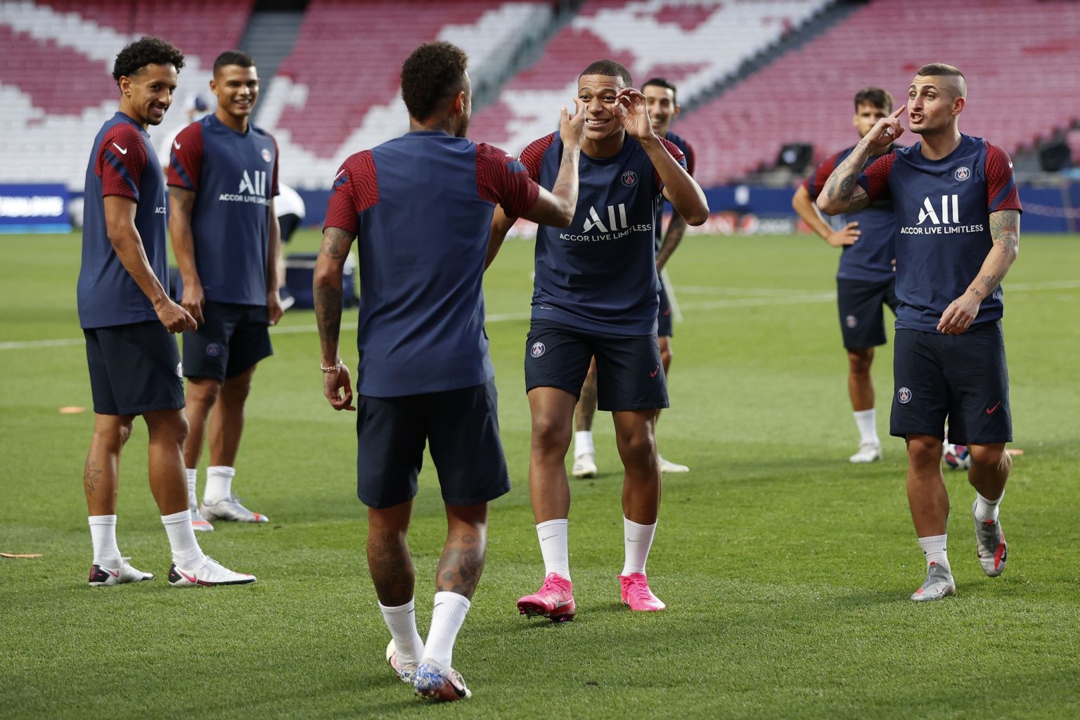 Paris St Germain's Neymar, Kylian Mbappe and Marco Verratti during training on Aug 22, 2020.