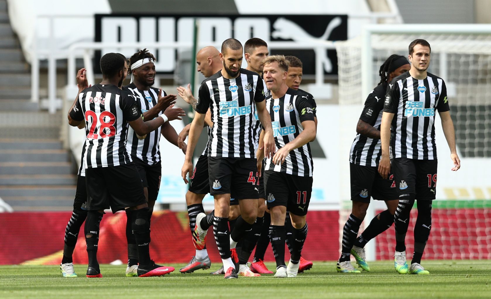 Newcastle United's Dwight Gayle celebrates a goal with teammates.