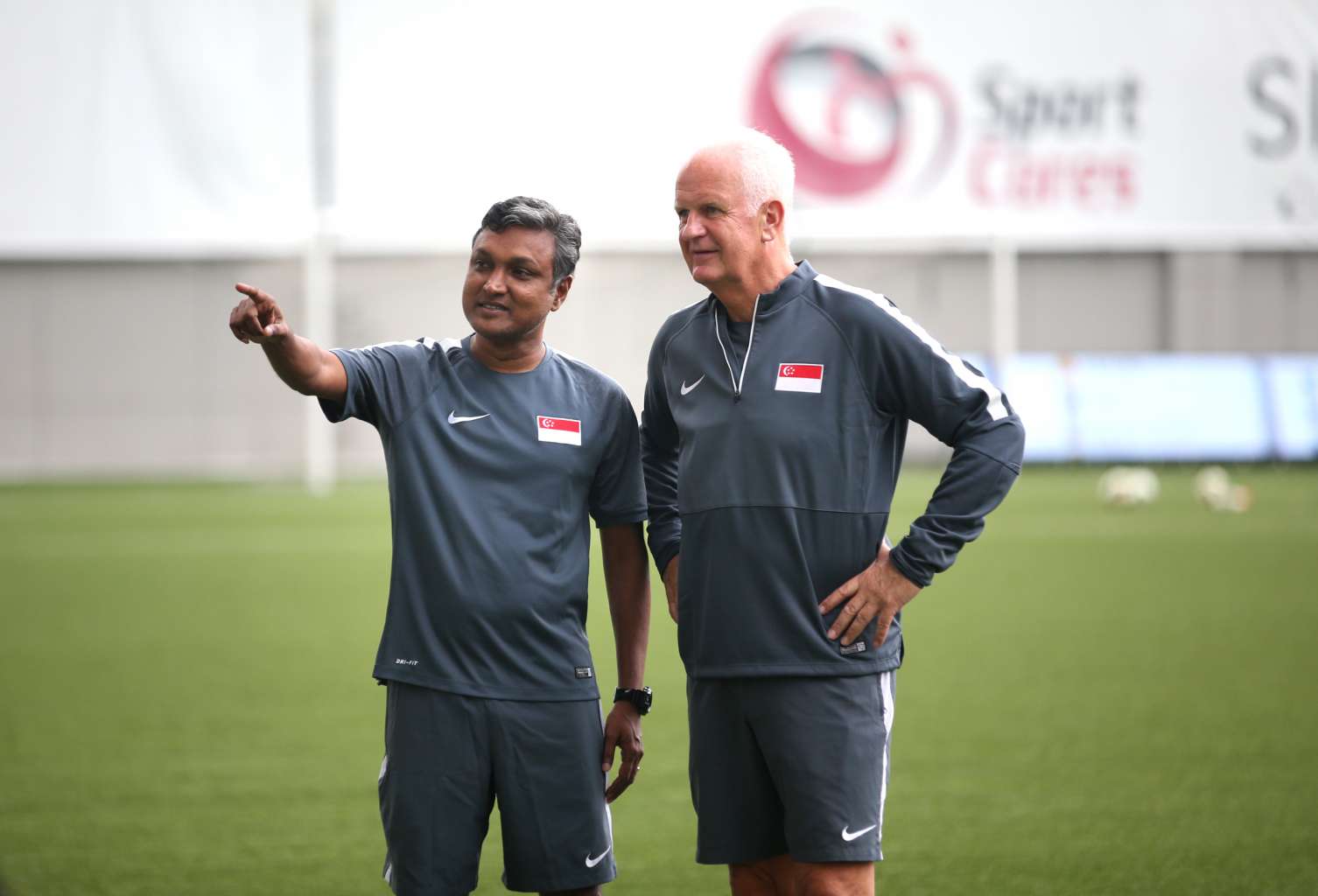V Sundramoorthy (left) will be replacing Bernd Stange as caretaker head coach of the national team.