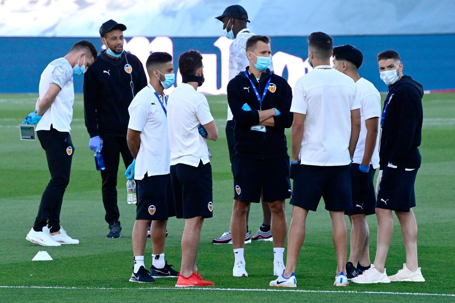 Valencia players gather on the pitch at the Alfredo di Stefano stadium in Valdebebas, Madrid, on June 18, 2020.