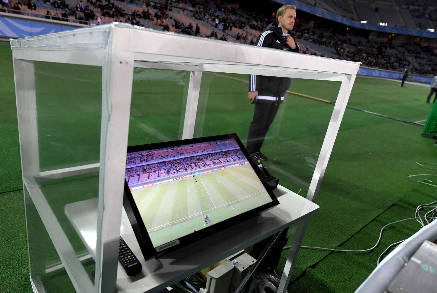 A video assistant referee system placed beside the pitch prior to the Club World Cup semi-final football match between Mexico's Club America and Spain's Real Madrid in Yokohama.